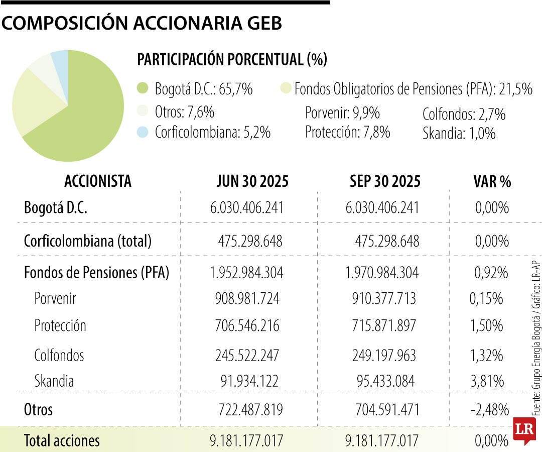 Con corte al 30 de septiembre de 2025, la composición accionaria del GEB refleja que el Distrito Capital sigue siendo el accionista mayoritario con 65,7% de participación. Los fondos obligatorios de pensiones (PFA) poseen 21,5% del capital, distribuidos entre Porvenir (9,9%), Protección (7,8%), Colfondos (2,7%) y Skandia (1,0%). Corficolombiana concentra 5,2%, mientras que otros inversionistas privados suman el 7,6% restante.