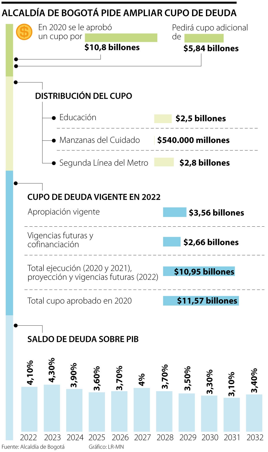 Este lunes, la Alcaldía de Bogotá anunció que pedirá al Concejo de la ciudad un aumento en su cupo de endeudamiento en $5,8 billones. Estos recursos se destinarán a programas sociales, así como a financiar la construcción de la Segunda Línea del Metro.