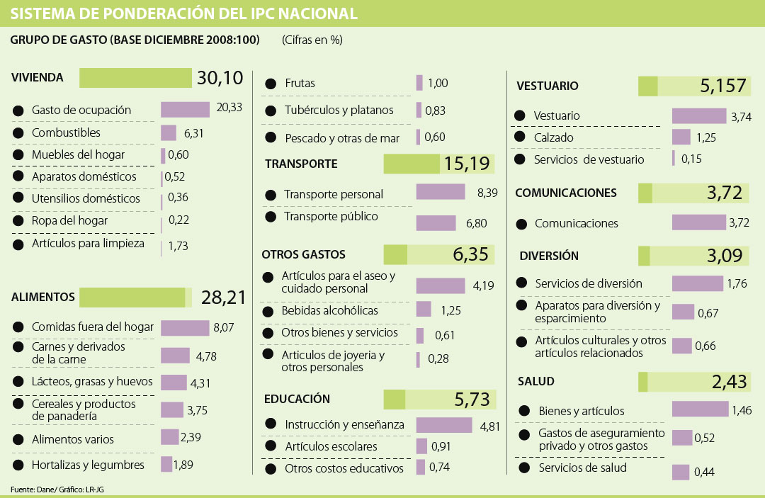 Pero ¿qué tan posible es que si uno de los gastos básicos se dispara afecte la inflación total? La respuesta dependerá del peso que tenga cada uno de los productos. Y es que la metodología del Dane se basa en un sistema de ponderaciones a partir de la información recolectada por la Encuesta de Ingresos y Gastos (2006-2007) que permite promediar las variaciones individuales de los precios de cada artículo constitutivo de esa canasta en función de las ciudades y de los estratos.