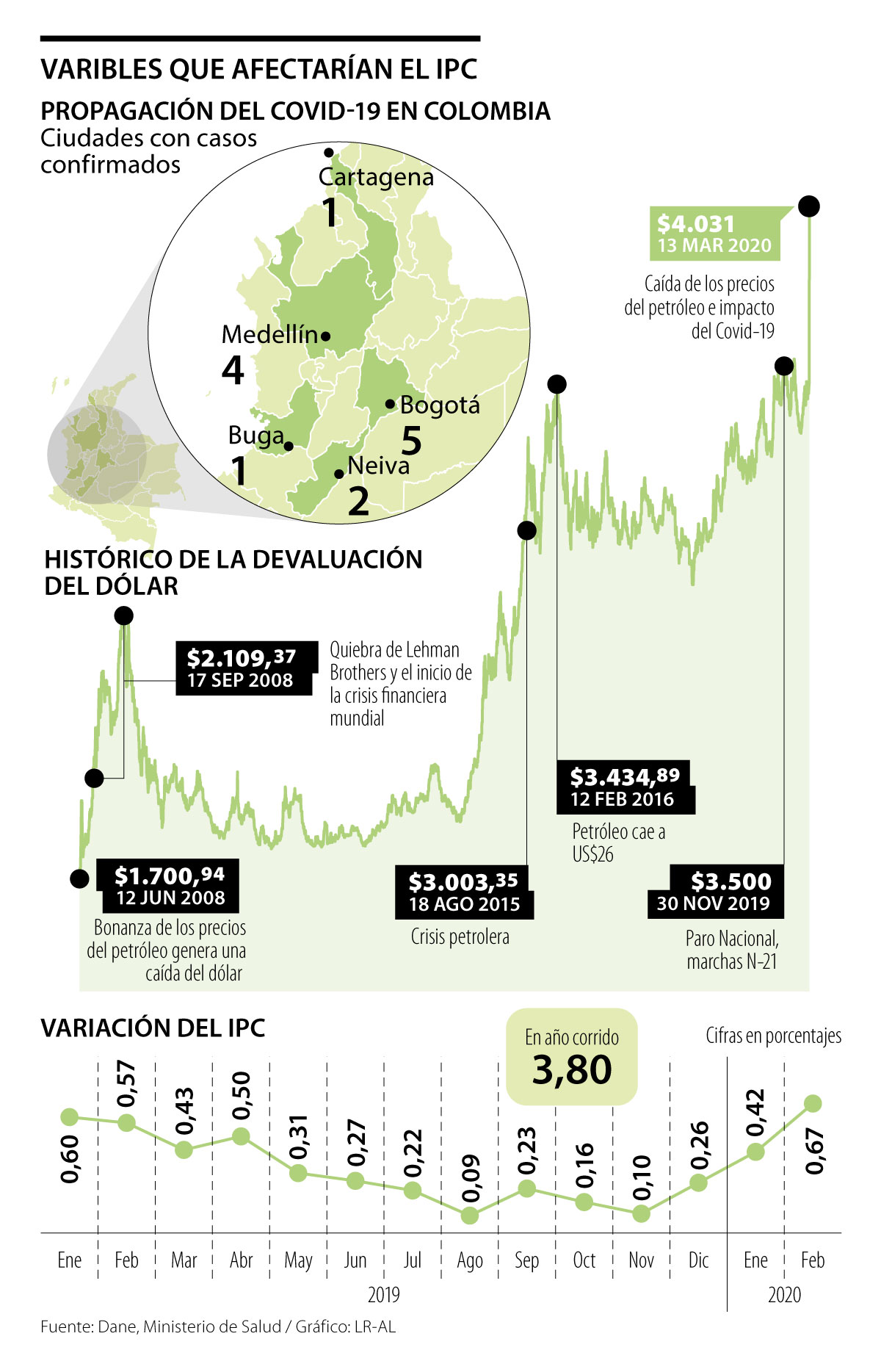 Y si bien las consecuencias más fuertes derivadas de este fenómeno se sentirían en el mediano y largo plazo, según Juan Daniel Oviedo, director del Departamento Administrativo Nacional de Estadística (Dane), “la primera señal que daría cuenta del impacto del Covid-19 en la economía local será la de la variación en los precios, es decir, el IPC que en este momento estamos midiendo y conoceríamos en abril”, dijo el funcionario.
