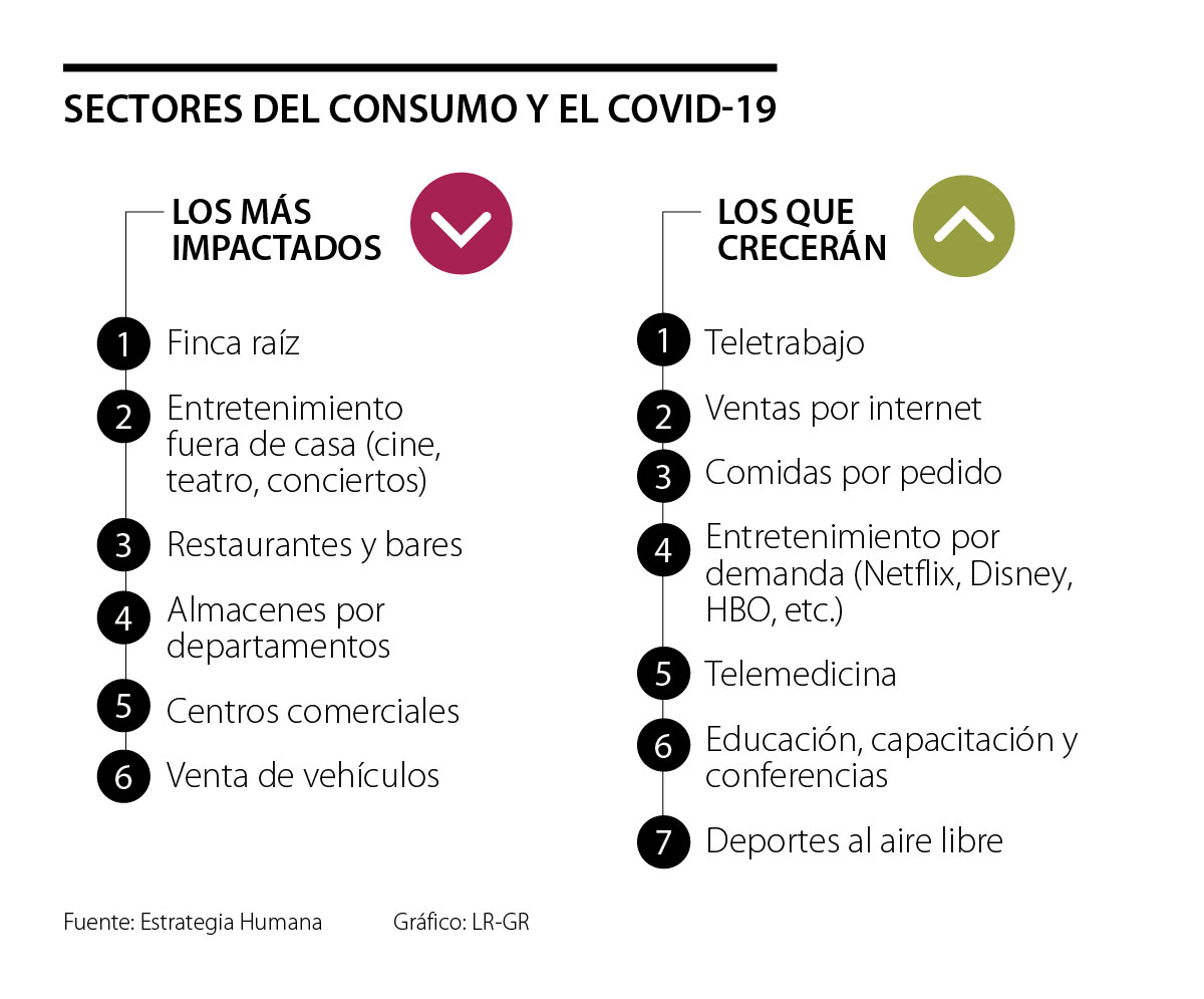 Un análisis realizado por la firma Estrategia Humana, cuyo gerente es Felipe Andrade, detalló los cambios que vienen para la población después del covid-19, y entre los hallazgos estuvo que los sectores que van a experimentar un mayor crecimiento son el teletrabajo; las ventas por internet; comidas por pedido; entretenimiento por demanda (Netflix, Disney, HBO); telemedicina; educación, y los deportes al aire libre.