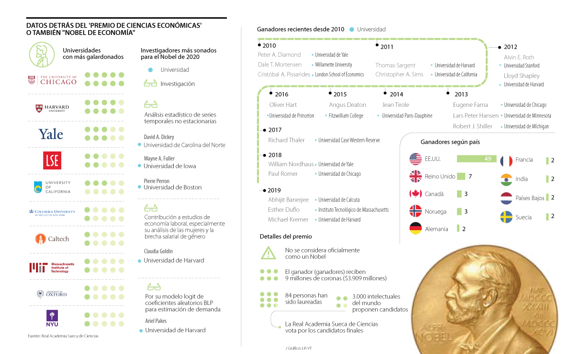 El próximo lunes la Real Academia Sueca de Ciencias (Rasc) revelará quién será la persona o el grupo de mentes que se quedó con el Nobel de Economía en 2020. Pero detrás de este premio hay varias curiosidades, desde el perfil de quienes año a año se lo llevan, dónde estudiaron y hasta por más paradójico que parezca, este no es oficialmente reconocido como un Nobel.