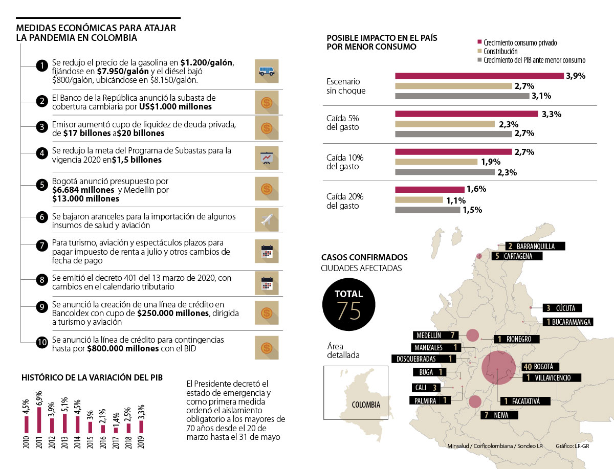Sin embargo, y a la espera de las instrucciones que dicte hoy el Ejecutivo, la incertidumbre que ha creado la propagación del Covid-19, la devaluación y la caída del precio del petróleo, el Gobierno ha ido anunciando una serie de medidas encaminadas a atajar esos choques (ver recuadros), tanto en lo social; como en lo económico, frente en el que se han adherido decisiones del Banco de la República y se han reglamentado cambios tributarios.