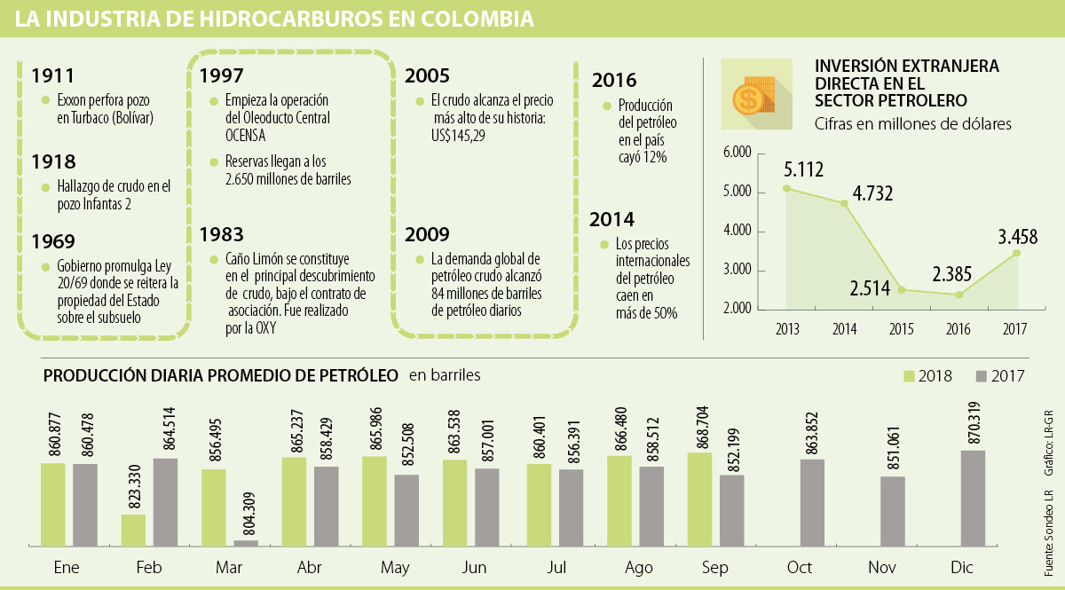 Este año se conmemoran 100 años desde que se hizo el descubrimiento del pozo en Infantas 2, uno de los grandes hitos de la industria petrolera en el país. Inicialmente, el campo la Cira-Infantas produjo 42 barriles al día, mientras que hoy llega a 46.000. Fernando Cepeda, doctor en derecho y ciencias políticas de la Universidad Nacional, destacó que la industria de los hidrocarburos ha tenido un impacto en las políticas interna y externa, pues ha marcado la agenda y la comercialización.