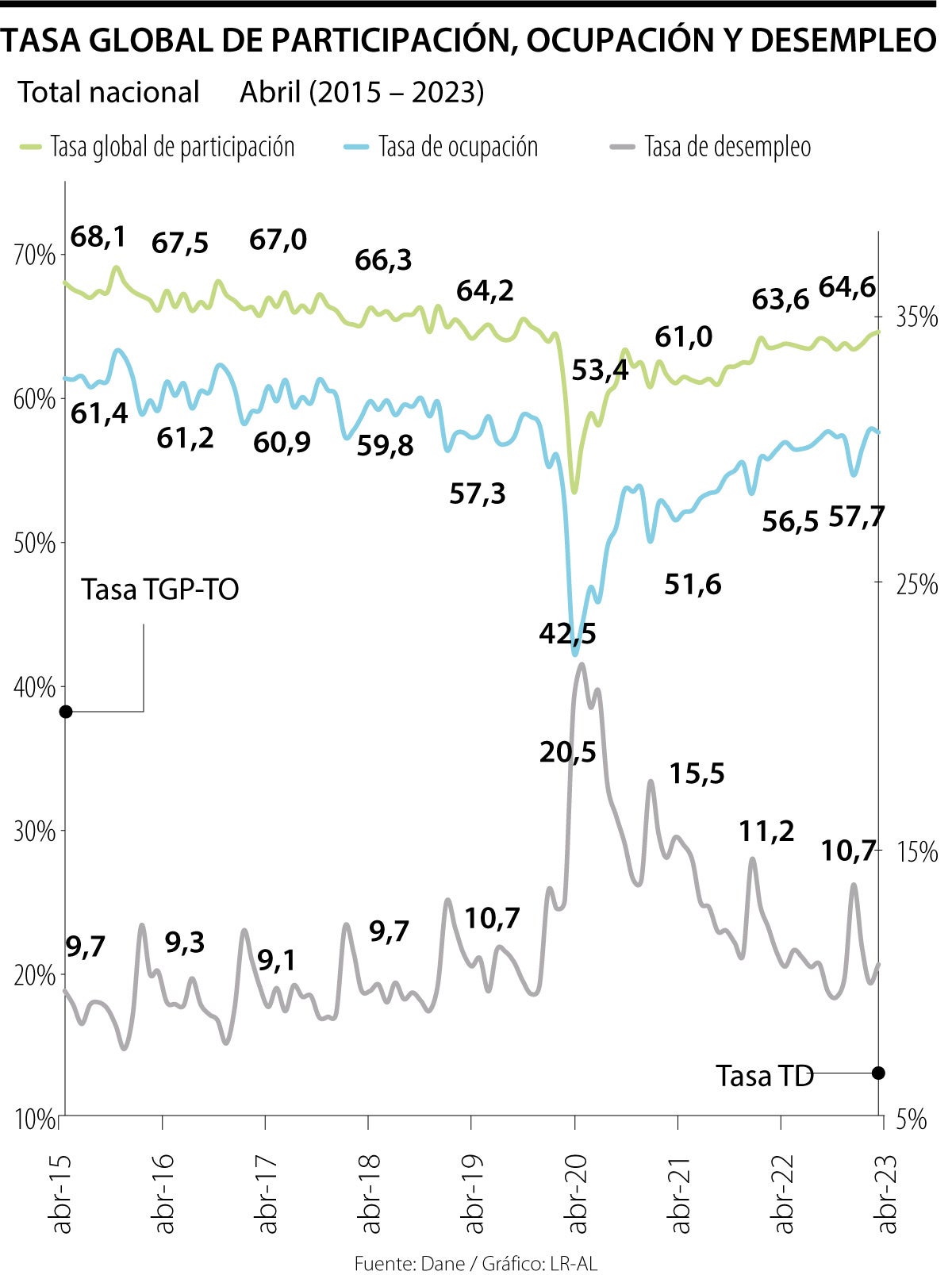 La directora del Dane, Piedad Urdinola, explicó que, para abril, la tasa global de ocupación llegó a 64,6%, con “un incremento que es estadísticamente significativo, pues la tasa de ocupación quedó en 57,7%”.
