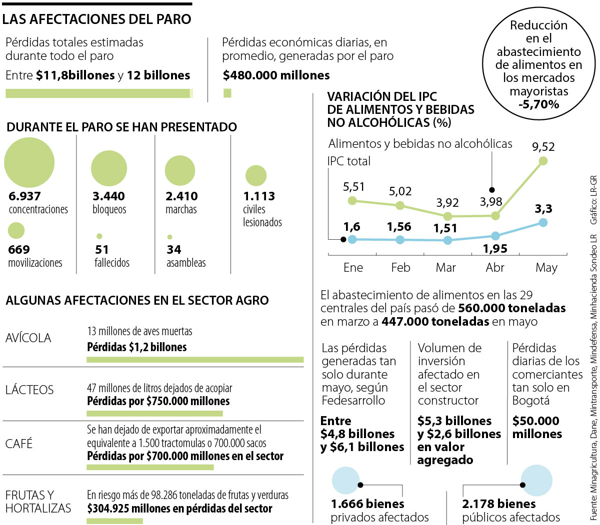 Las afectaciones económicas diarias se estiman, en promedio, en $480.000 millones de acuerdo con el Ministerio de Hacienda. El cual también afirmó que las pérdidas totales de estos 50 días de paro oscilan entre $11,8 billones y $12 billones.