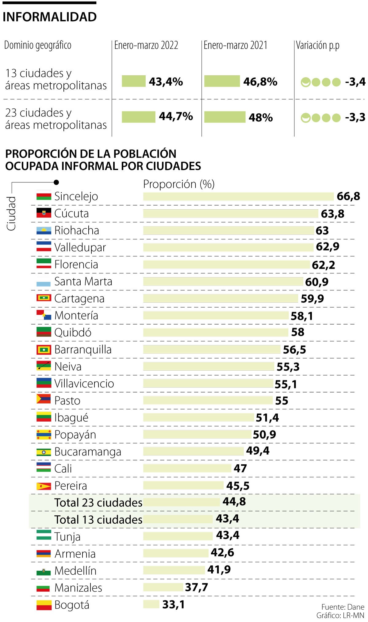 El Dane reveló que el índice de informalidad durante los primeros tres meses del año se ubicó 44,8%, es decir, 3,3 puntos porcentuales menos que el mismo periodo de 2021