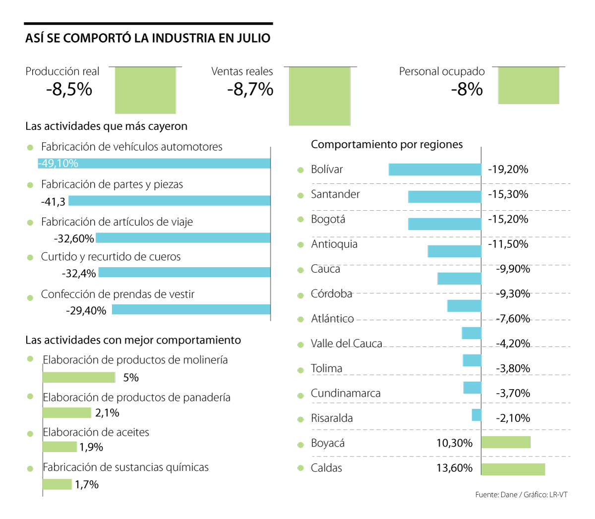 Un nuevo reporte de la industria colombiana hecho por el Dane, el cual demuestra el desempeño de este sector en la economía, reveló que en julio la producción real de esta cayó nuevamente y se ubicó en -8,5%, frente al mismo mes de 2019.