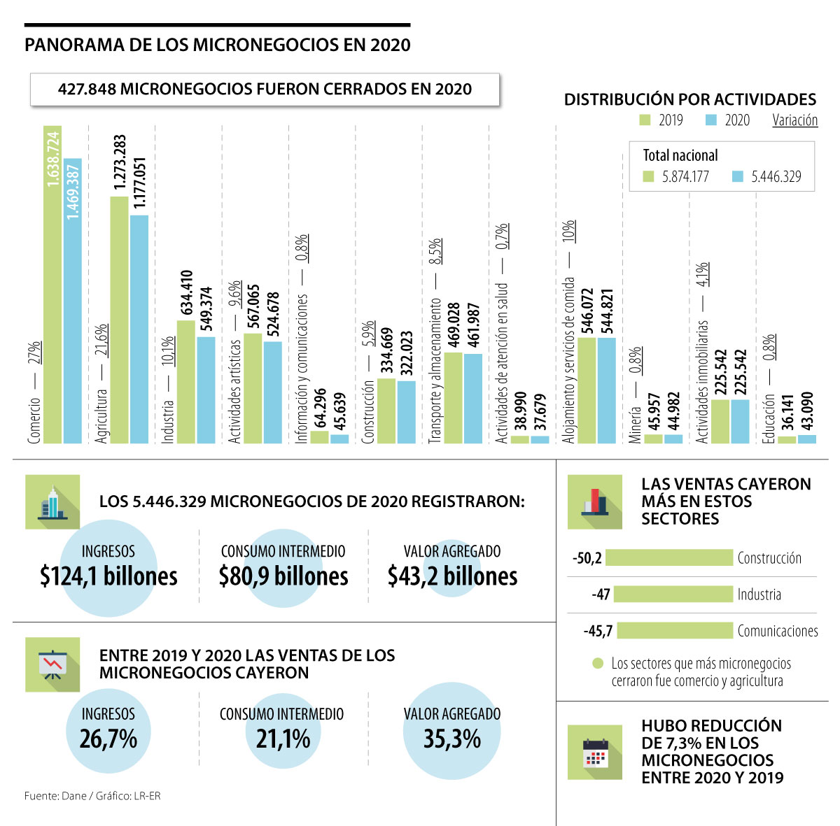 Este panorama no solo se dio a nivel macro, pues parte importante que compone a la economía, es decir, los micronegocios, que representan más de 60% del tejido empresarial, tuvieron una reducción entre 2020 y 2019, según información del Departamento Administrativo Nacional de Estadística (Dane).