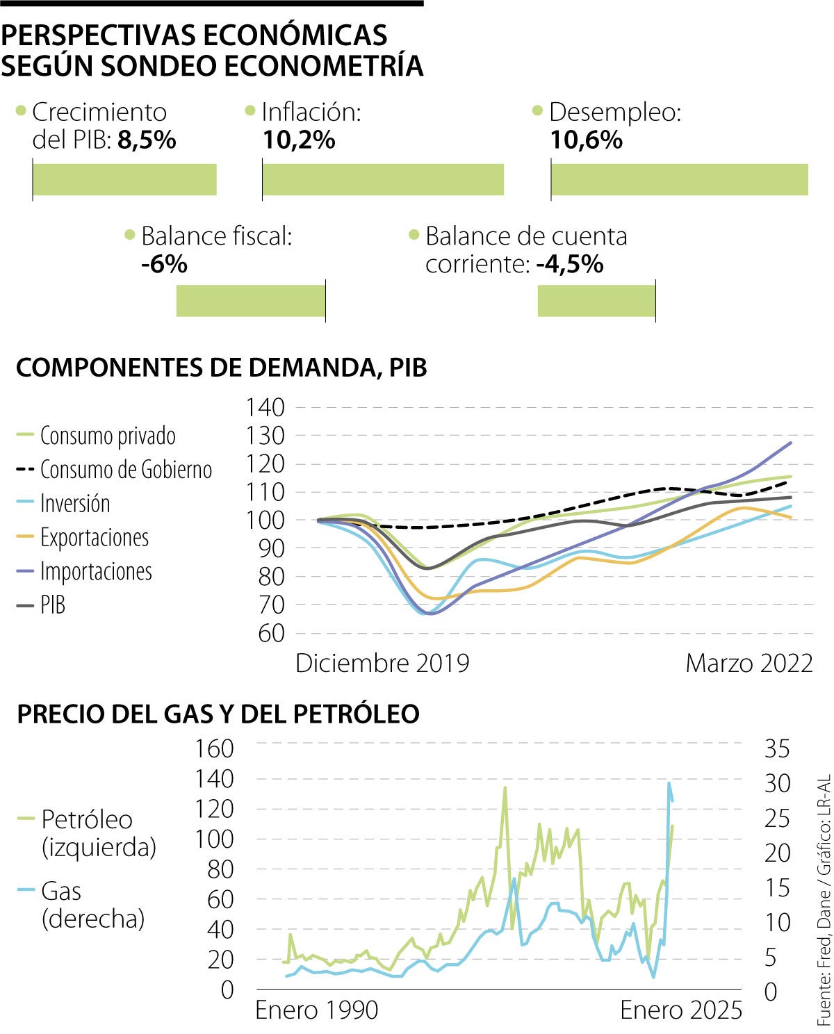 Econometría resume este capítulo con una proyección de 8,5% en el repunte del PIB en el consolidado de 2022, según su revisión nueva, vienen de una proyección de 6,3% en el reporte de febrero. El comentario de la entidad se basa en "desaceleración del consumo del Gobierno, subsidio a la gasolina, desaceleración del consumo de los hogares, inflación, agotamientos del efecto rebote y ahorros acumulados, exportaciones no han repuntado, pero lo harán, por el petróleo. Importaciones por las nubes, exceso de demanda, la inversión finalmente superó los niveles prepandemia".