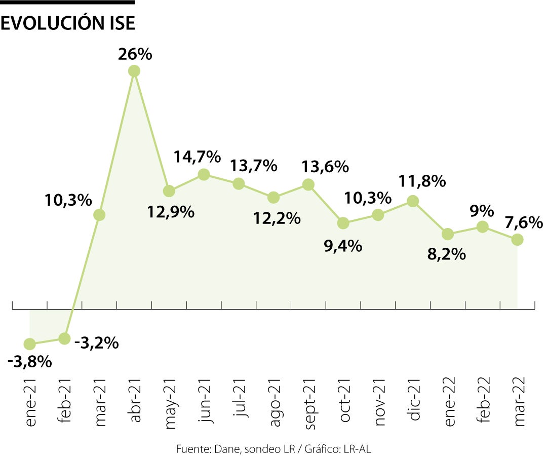 La tasa de 7,6% en marzo se suma al crecimiento de 8,2% en enero y 9% en febrero, según los datos del Indicador de Seguimiento de la Economía (ISE), (veáse gráfico). Estas dos cifras tuvieron una importante revisión al alza dado que originalmente se había presentado una tasa de 7,7% para el primer mes y 8,1% para el segundo.