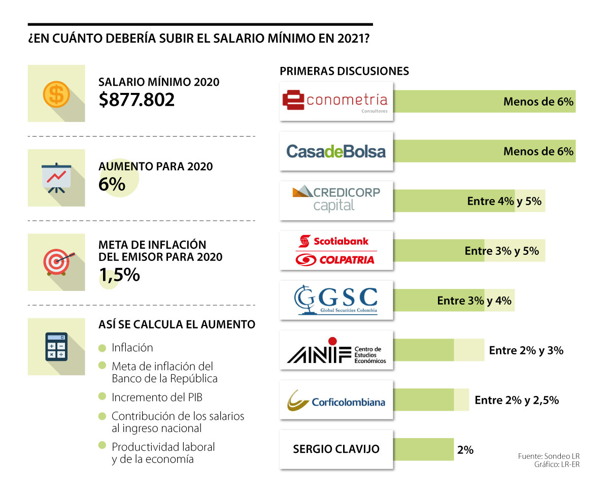 Cada vez más se acerca el inicio de las discusiones entre gremios, centrales obreras y el Gobierno, quienes definirán el aumento del salario mínimo para el próximo año en medio de la crisis económica que causó la pandemia, pero ya los economistas dicen que el alza no puede ser similar a 6% de 2020.
