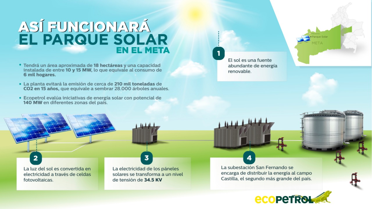 La construcción del proyecto empezará en el primer semestre de 2019 en el municipio de Castilla La Nueva. El parque solar tendrá un área aproximada de 18 hectáreas y una capacidad instalada de entre 10 y 15 MW, lo que equivale al consumo de 6.000 hogares.