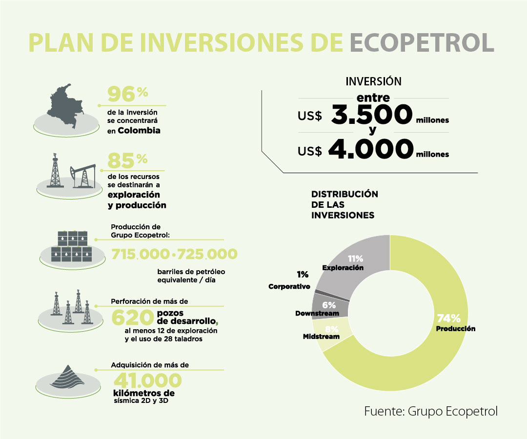 El Grupo Ecopetrol anunció que el próximo año invertirá entre US$3.500 millones y US$4.000 millones, recursos de los cuales 96% se destinarán a proyectos en Colombia "con el foco en aumentar reservas e incrementar la producción en el territorio continental".