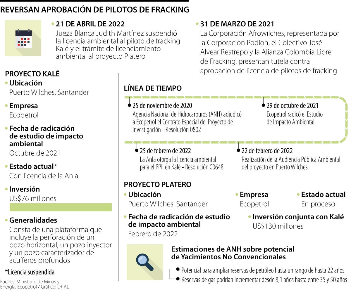 Ante esto entonces, Ecopetrol manifestó que acudirá a las instancias legales correspondientes para que se considere la posibilidad de continuar con el proceso de licenciamiento ambiental de los dos proyectos piloto en Puerto Wilches (Santander), pues la suspensión también aplica para el proyecto de Platero, que aunque aún está a la espera de la licencia, también busca incursionar en la técnica de fracking.