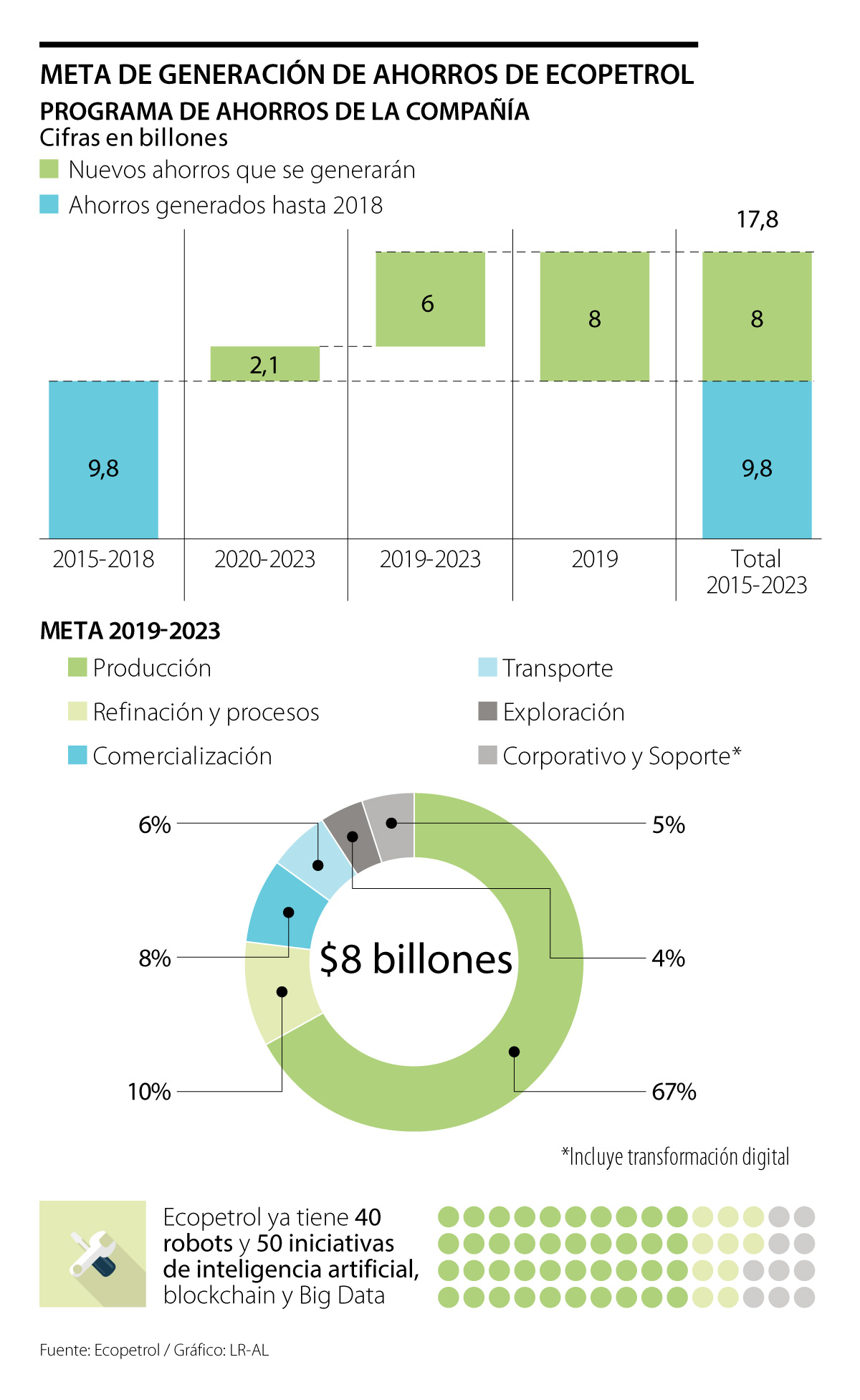 “La compañía atraviesa un proceso de transformación que ha permitido ahorrar hasta $10,2 billones entre 2015 y el primer trimestre de este año. Ello ha ayudado a que financieramente la empresa esté mejor y más robusta. Hoy anunciamos que hemos identificado otros $8 billones que podemos ahorrar en los próximos años”, manifestó Felipe Bayón, presidente de la compañía, quien aseguró que si el precio del barril Brent está a US$65 la estatal podrá generar más de $60 billones de caja.