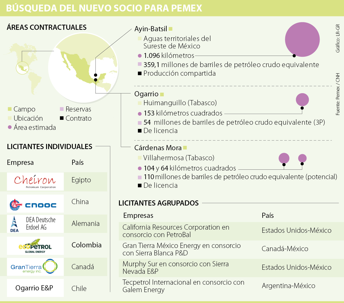 Dentro de los licitantes individuales está Cheiron Holdings, de Egipto; China Offshore Oil Corporation, de China; DEA Deutsche Erdoel, de Alemania: Gran Tierra México Energy, filial mexicana de la empresa canadiense; y la chilena Ogarrio E&P, la cual fue conformada para este proceso.