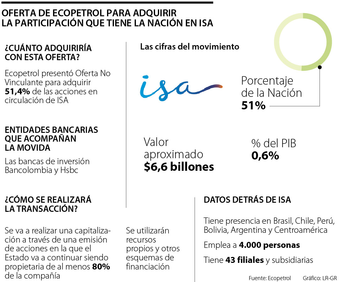 "La inversión en ISA representaría un paso transformacional en el posicionamiento del Grupo Ecopetrol para liderar dicha transición energética y avanzar en la descarbonización. El Grupo se fortalecería con activos de infraestructura energética de clase mundial que generarían un flujo material de ingresos en negocios de bajas emisiones. La transacción tiene un gran potencial de generar valor gracias a la creciente demanda de energía y a la incorporación de nuevas fuentes renovables que requieren ser conectadas con los usuarios finales, así como al aumento esperado de la electrificación", añadió la compañía.