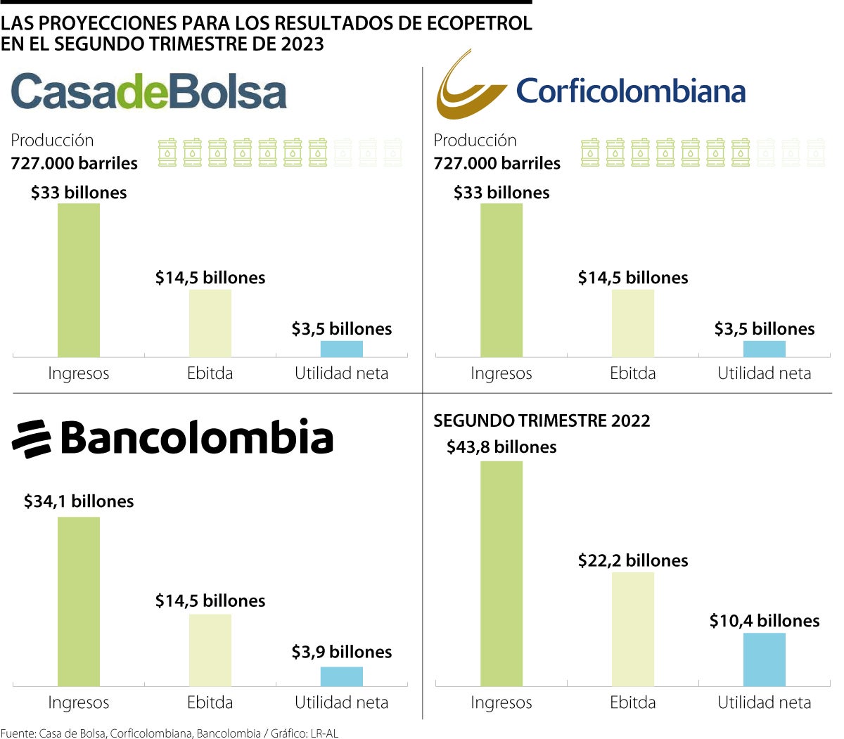 En el sondeo que recoge datos de Casa de Bolsa, Bancolombia y Corficolombiana, se encuentra que la expectativa más alta para los ingresos es la de Bancolombia, con $24,1 billones. Y las otras dos entidades coinciden con una proyección de $33 billones.