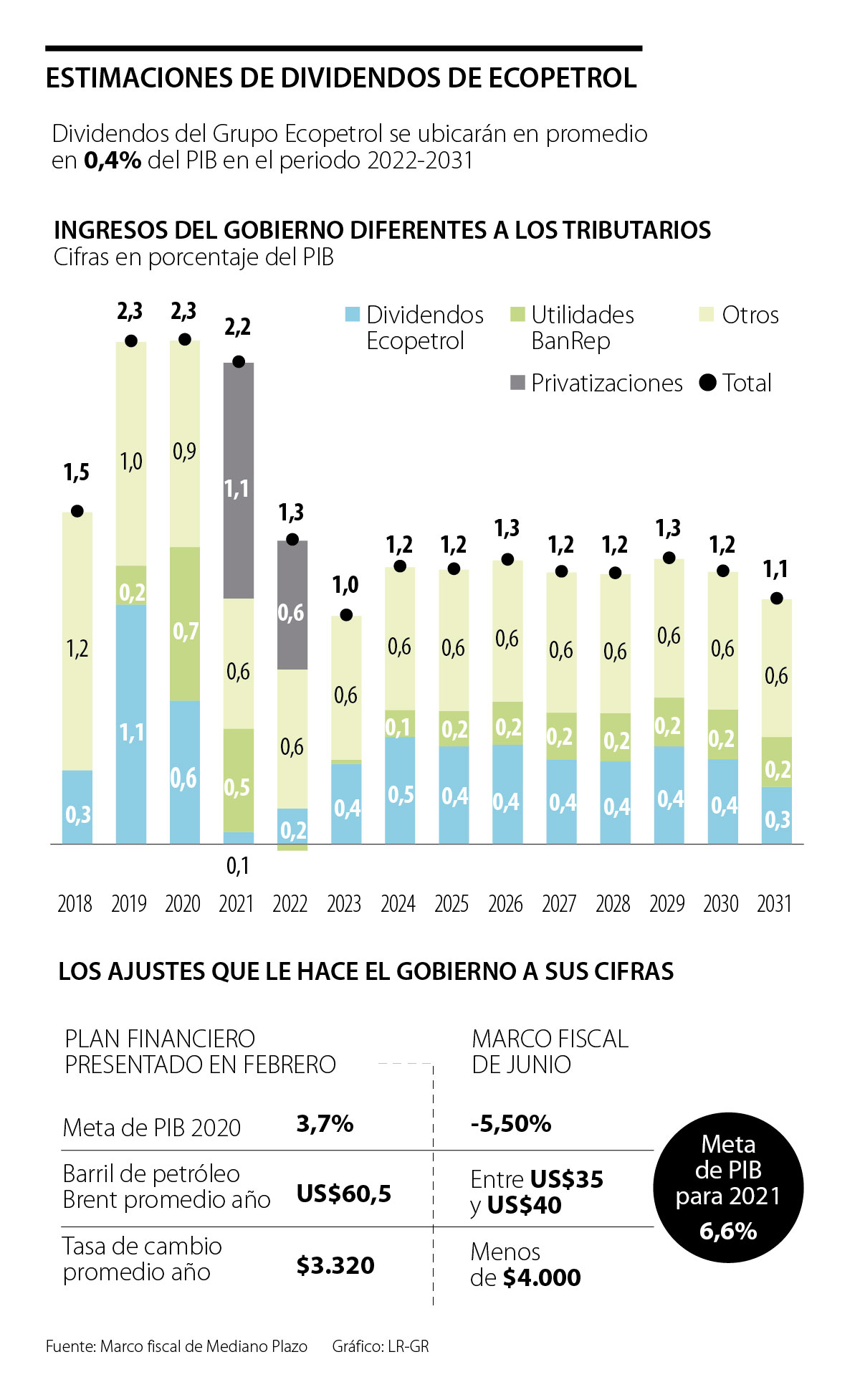 “En lo respectivo a los dividendos del Grupo Ecopetrol, para 2020 se esperan ingresos por 0,6% del PIB, presentando una reducción de 0,4 puntos porcentuales frente a lo observado en 2019. Los menores ingresos se deben puntualmente a que para 2020 no se presentarían dividendos extraordinarios ni se espera liberar parte de la reserva ocasional como ocurrió en 2019”, cita el Marco Fiscal.