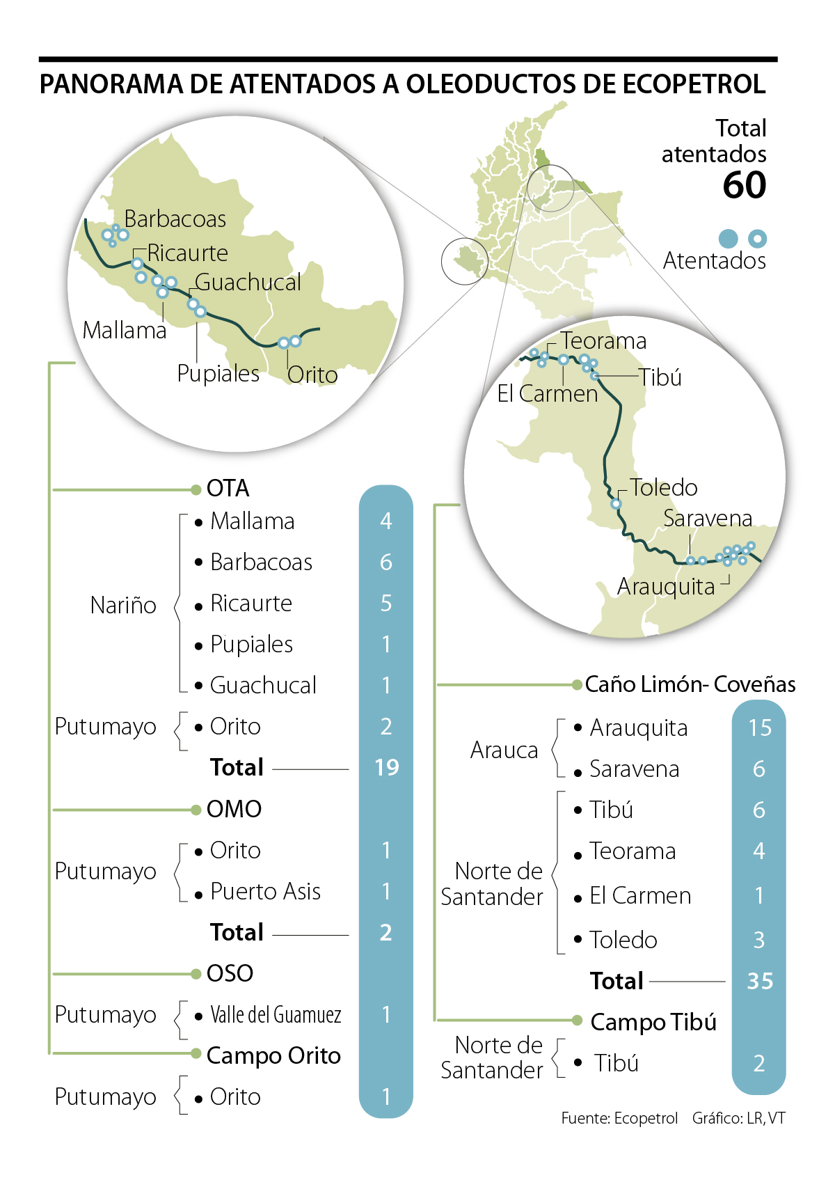 Las acciones terroristas a la red de oleoductos del país no cesan. Con el más reciente ataque al Oleoducto Trasandino (OTA), en el Putumayo, este fin de semana, Ecopetrol confirmó que ya son 60 atentados en lo corrido del año, una cifra que no solo ha venido afectando a los ecosistemas y a las comunidades, sino también a los más de 4.540 kilómetros de tubería que tiene la petrolera en Colombia.