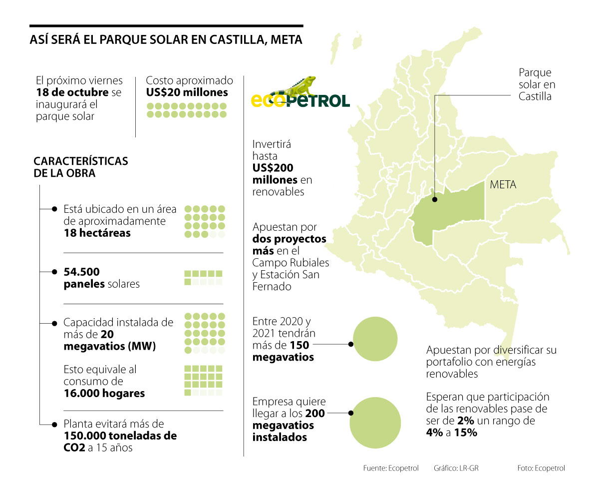 Todo está listo para que el próximo 18 de octubre Ecopetrol inaugure su primer parque solar en el municipio de Castilla La Nueva, en el Meta. Tras una inversión de un poco más de US$20 millones, la petrolera pondrá en operación el nuevo complejo, que cuenta con una capacidad instalada de 20 megavatios (MW), en un total de 54.500 paneles en servicio.