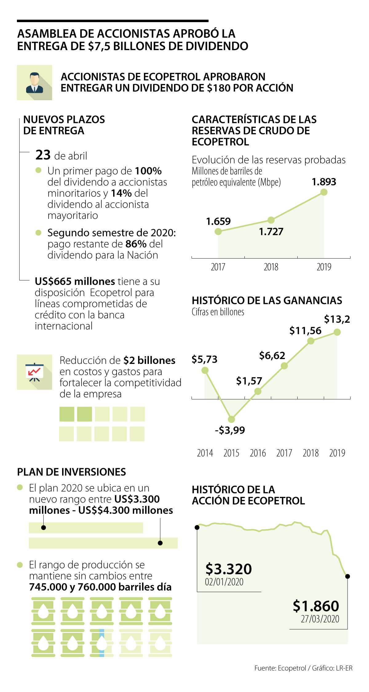 La Asamblea General de Accionistas de Ecopetrol, que fue virtual, aprobó ayer la propuesta de entregar un dividendo de $180 por acción sobre las utilidades alcanzadas en 2019. En medio de la coyuntura por el Covid-19, los accionistas aprobaron dar $7,5 billones de rendimientos, por lo que la compañía aseguró una reserva ocasional de $4,5 billones.