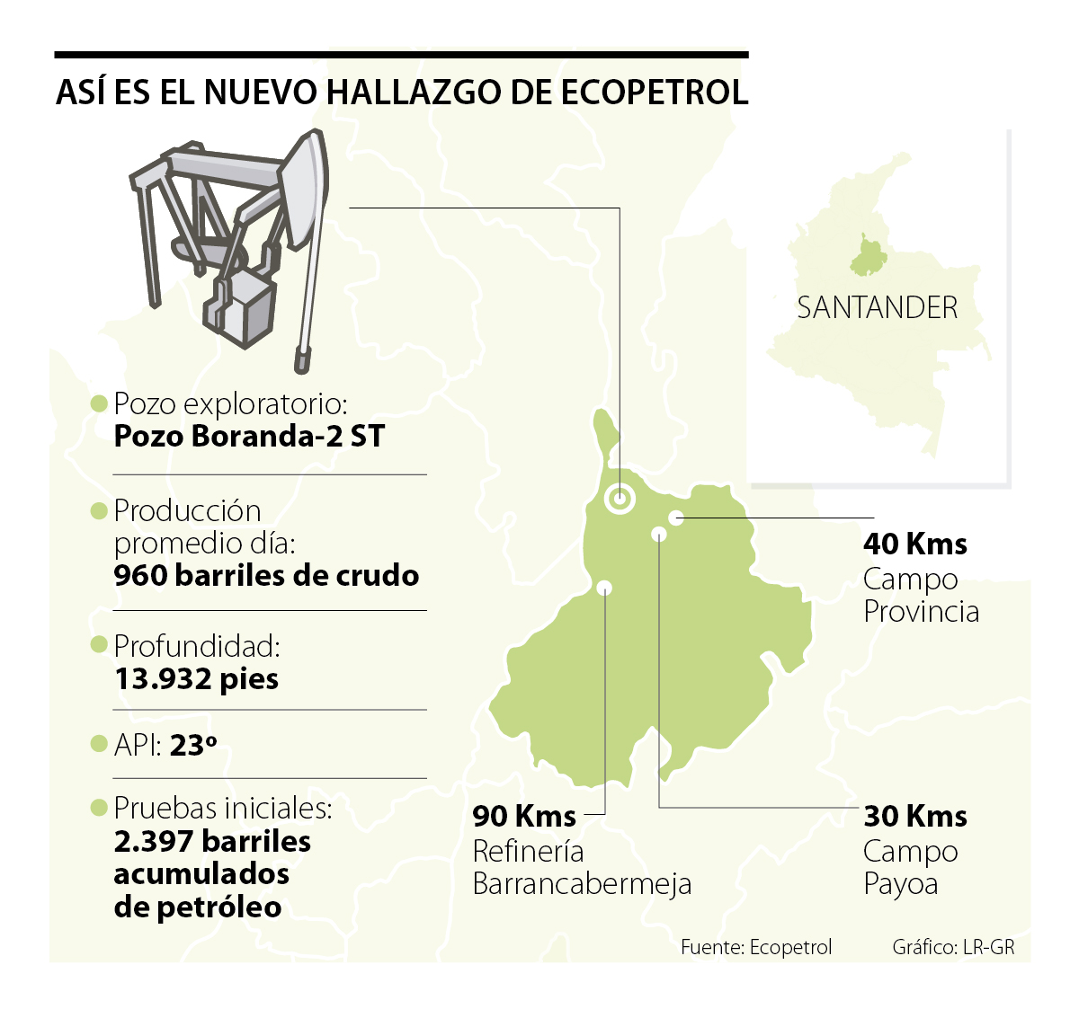 Alberto Consuegra, vicepresidente ejecutivo de Ecopetrol, explicó que “este hallazgo hace parte de la estrategia de incremento de reservas de Ecopetrol, que incluye como uno de sus focos explorar zonas cercanas a campos de producción. En este caso, los pozos Boranda se encuentran en la franja productora de los campos Pavas-Cáchira al noreste”.
