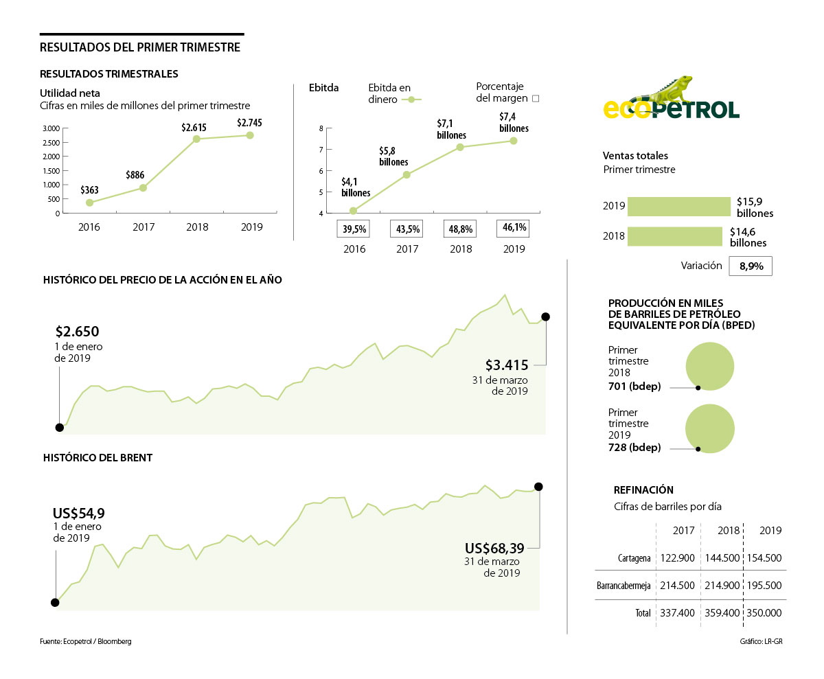 Pese a que en el trimestre se dio una caída de US$67,2 a US$63,8 en el precio del petróleo Brent en comparación con 2018, Ecopetrol registró unas utilidades por $2,7 billones y una canasta de venta de crudo a US$56,2 por barril, US$7,6 por debajo del precio internacional. Esta cifra se tradujo en un incremento de 5% en la utilidad que fue jalonada, según la compañía, por los mayores ahorros en los gastos financieros que le permitieron compensar el menor precio del petróleo.