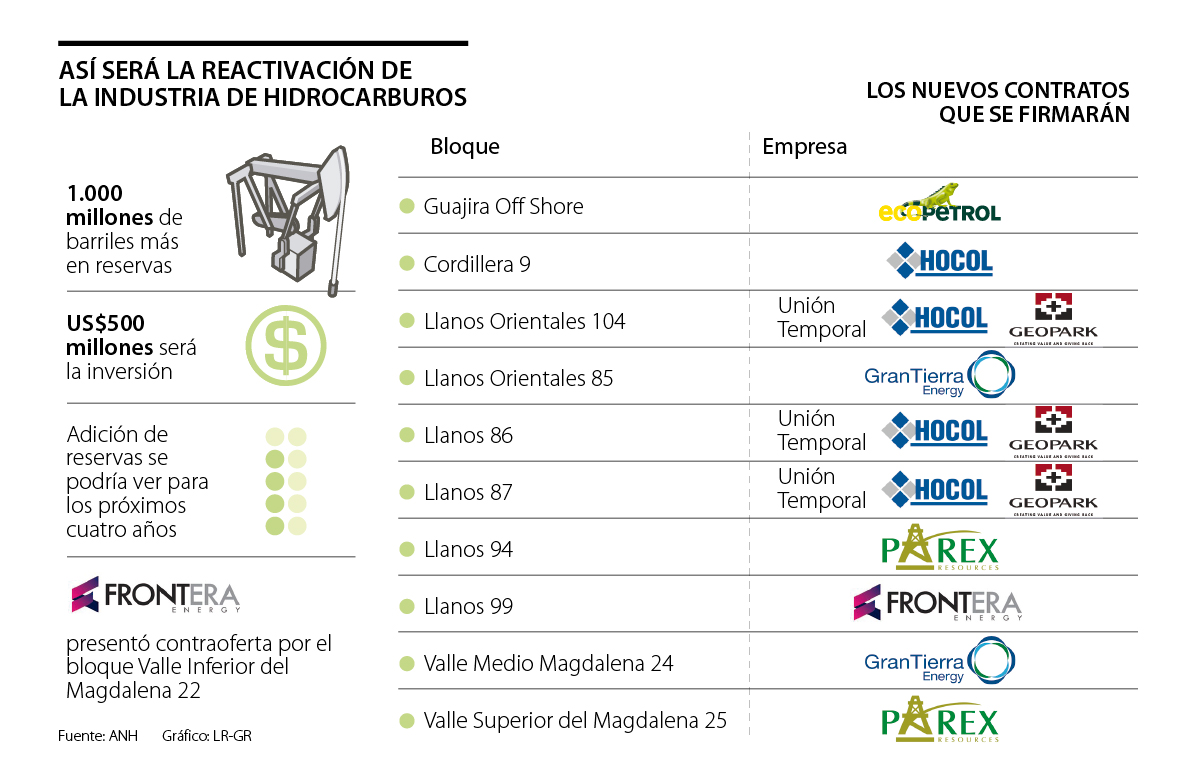 Aunque Ecopetrol y Hocol se quedaron con 50% de las áreas de esta primera puja petrolera, otras empresas como GeoPark, Parex Resources y Frontera Energy también entraron en ese grupo de asignaciones. Con esta reactivación, se prevé que en menos de cuatro años se llegue a los 3. 000 millones de barriles en reservas: 1.958 millones actuales, más los 1.000 millones que se sumarían con la producción de los nuevos bloques.