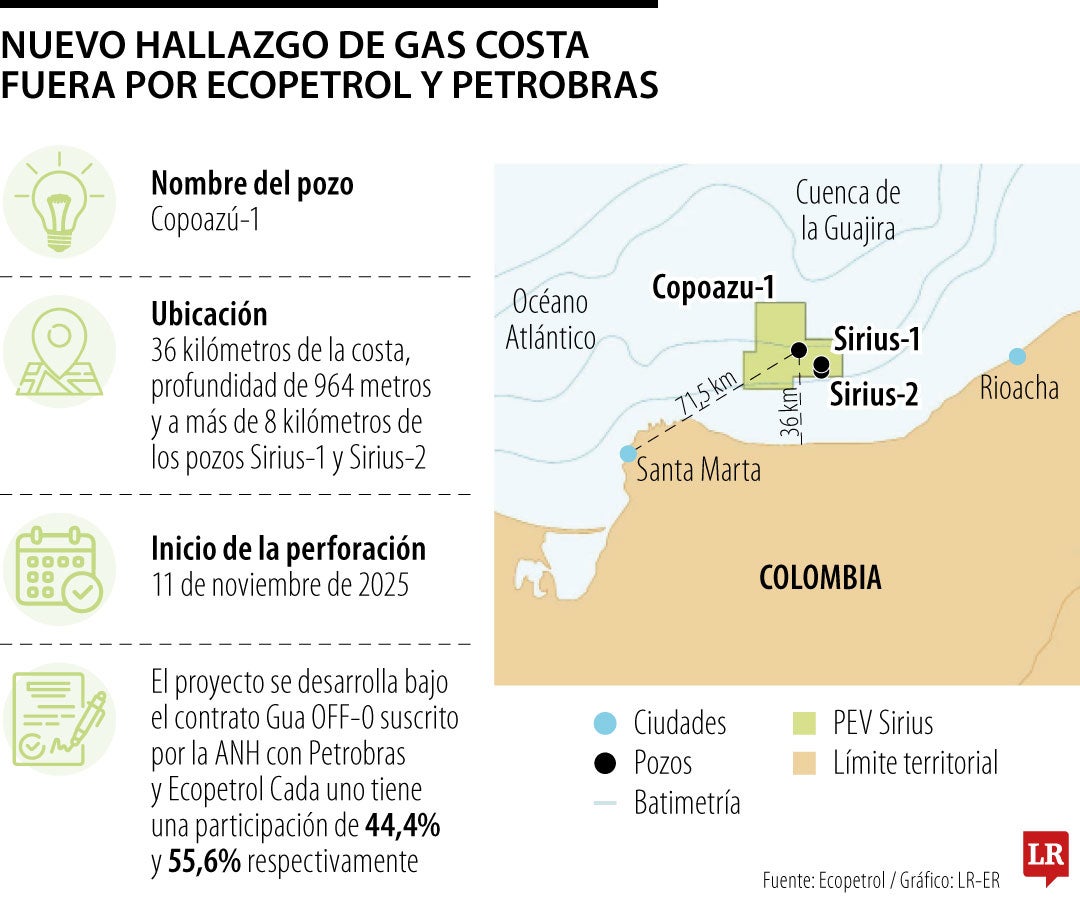 Ecopetrol y Petrobras confirmaron el hallazgo de gas offshore en el pozo Copoazú-1 cerca del lugar de la explotación del proyecto Sirius, en el Caribe colombiano. La perforación del pozo se inició el 11 de noviembre del año pasado aunque aún no se conoce los volúmenes de gas que podría aportar.