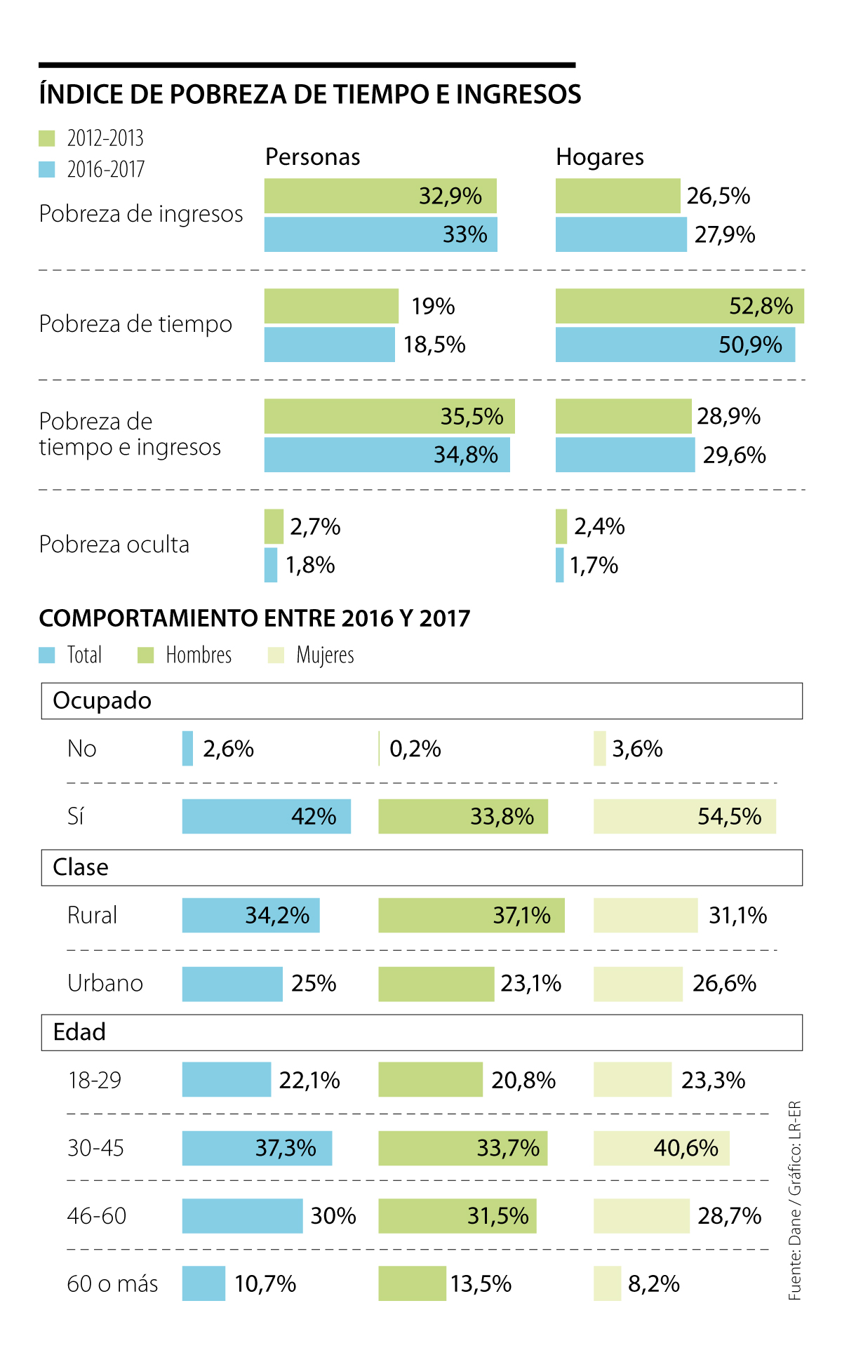 No obstante, de acuerdo con la investigación publicada ayer pero trabajada con datos de 2017, estas dos cifras registraron una leve mejoría, pues en 2013, cuando se hizo la anterior medición, la pobreza de tiempo en el hogar era de 52,8% y en las personas, de 19%.