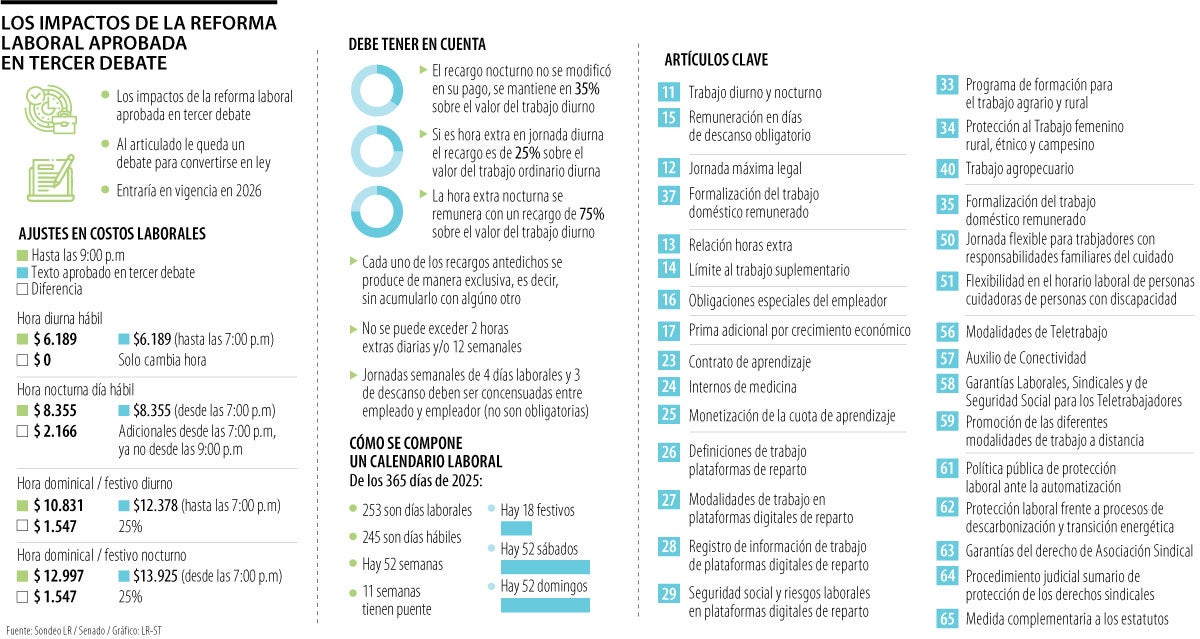 La jornada nocturna de domingos o festivos pasará de $12.997 a $13.925. En la Comisión Cuarta del Senado acordaron exceptuar a las micro y pequeñas empresas, aun así, Alexander Grajales, gerente general de Soluciones Legales dijo que estos elementos aumentan los costos laborales de forma significativa sin que existan mecanismos de alivios para las compañías.