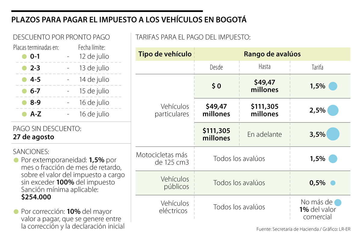 Las tarifas del impuesto a cargo van desde 0,5% hasta 3,5%, dependiendo del avalúo del vehículo. En el caso de los particulares, la tarifa es de 1,5% para aquellos cuyo valor sea de máximo $49,47 millones, de 2,5% para los que tienen un valor de entre $49,47 millones y $111,3 millones, y de 3,5% cuando el valor supera los $111,3 millones.