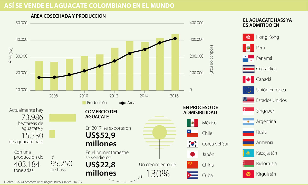 El impulso de las más recientes aprobaciones se evidencia en las cifras de ventas al mundo. De acuerdo con el Ministerio de Comercio, entre 2015 y 2017, las exportaciones de aguacate tuvieron un incremento de 413%, ya que avanzaron de US$10,3 millones, hasta US$52,9 millones.
