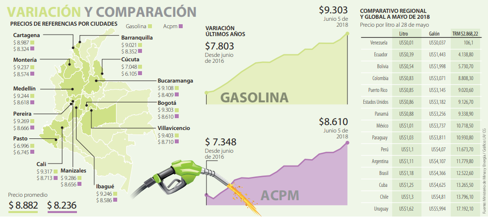 Según informó el Ministerio de Minas y Energía, el precio promedio para las 13 ciudades será de $8.882 para el galón de gasolina y de $8.236 para el de Acpm, una cifra que según especialistas pondría en vilo la meta de inflación de 3% estimada por el Banco de la República para finales de 2018.
