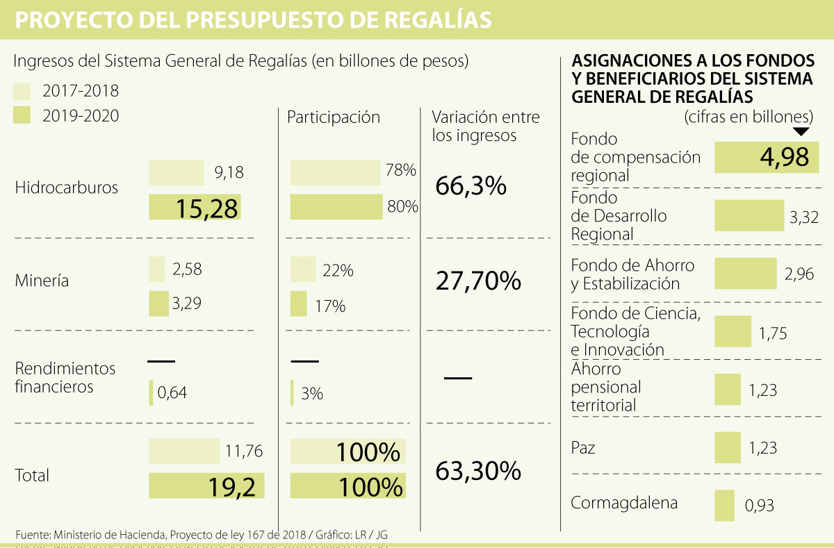 De hecho, los aportes de los hidrocarburos a los ingresos del Sistema General de regalías aumentaron a $15,28 billones, 66,3% más que los del bienio actual. Por su parte, los aportes de la minería incrementaron a $3,29 billones, 27,7% más que el del presupuesto 2017-2018.