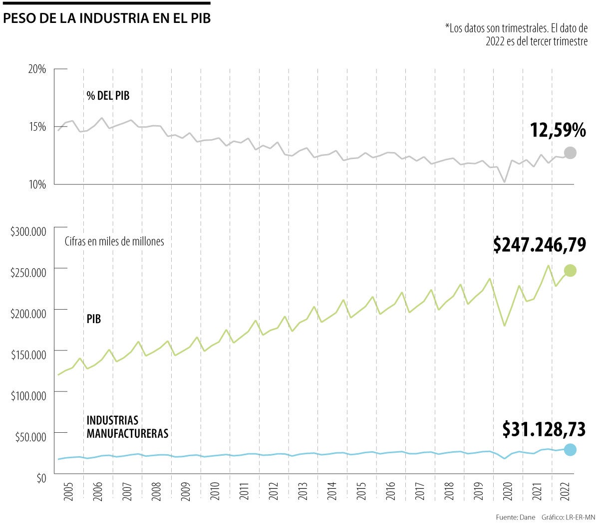Las cifras del Dane respaldan esta tesis. Durante los tres primeros trimestres de 2005 este sector pesaba 15,17% del PIB, mientras que en el mismo periodo de 2022 la cifra había caído a 12,44%, 18% menos en los últimos 17 años.