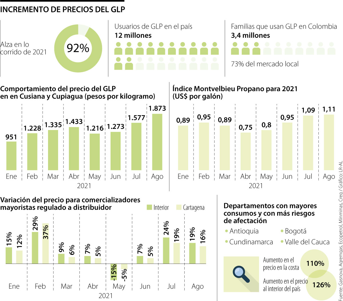 Adicionalmente, teniendo en cuenta que el servicio publico domiciliario de GLP llega a más de 1.050 municipios, departamentos como Antioquia, Cundinamarca y Bogotá, Valle del Cauca y Nariño, serían los más afectados por el aumento generalizado de los precios,