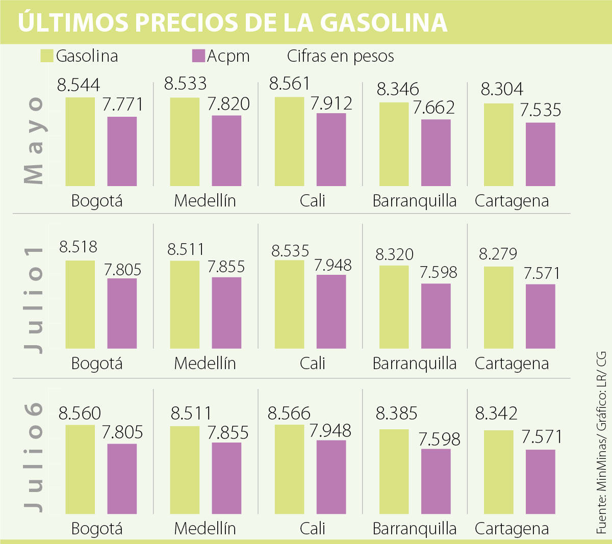 Para Vera, habría un ligero aumento por efecto del valor del etanol, el cual hizo que, por ejemplo, en julio el precio de referencia para Bogotá fuera de $8.518 para el primer día del mes y cinco días después aumentara a $8.560. En el caso del diésel, Vera afirmó que debería mantenerse estable.