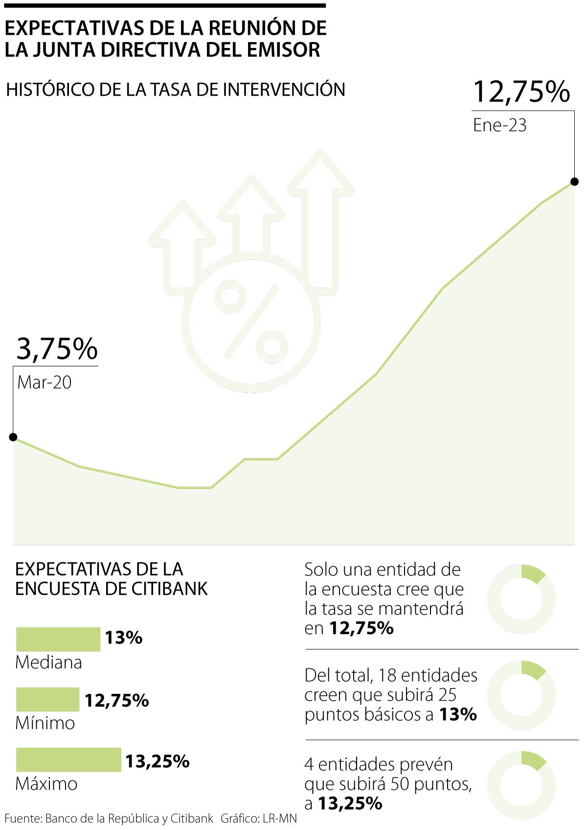 Las expectativas de los analistas apuntan a que el Emisor aumentará los tipos en 25 puntos básicos, pasando de 12,75% a 13%. Ello implica que se reduciría aún más el ritmo de subida de tasas, pues en la reunión de enero el incremento fue de 75 puntos, mientras que en ocasiones anteriores había sido de 100 puntos, e incluso de 150.