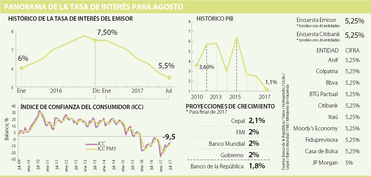 Hoy el Banco de la República va a realizar la octava junta directiva del año, en la cual los analistas esperan que la tasa de intervención baje 25 puntos básicos y la ubique en 5,25%. Además, esta sería la última reducción de 2017.