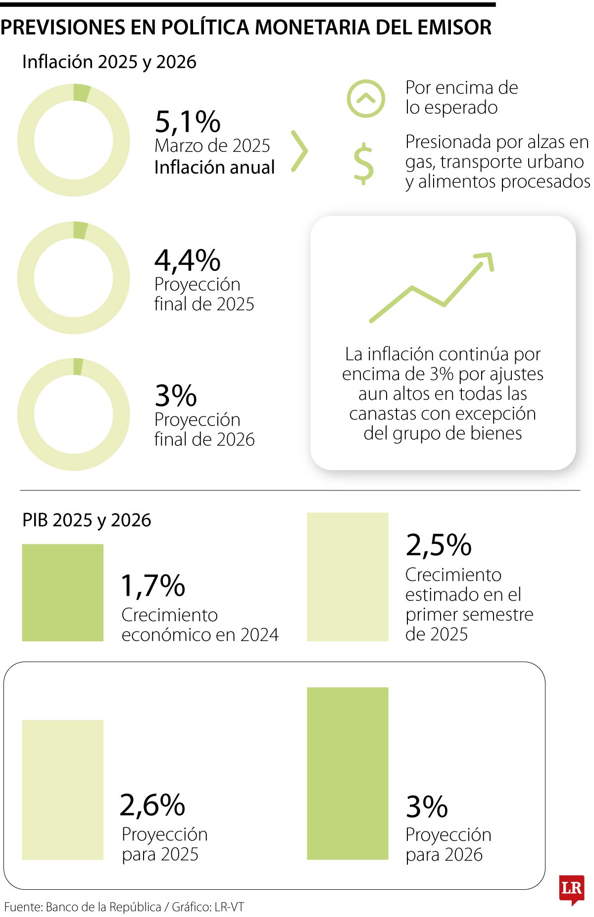 El Emisor detalla que con miras al futuro la actividad económica enfrenta choques negativos. Colombia crecerá 2,6% para 2025 y 3% para 2026