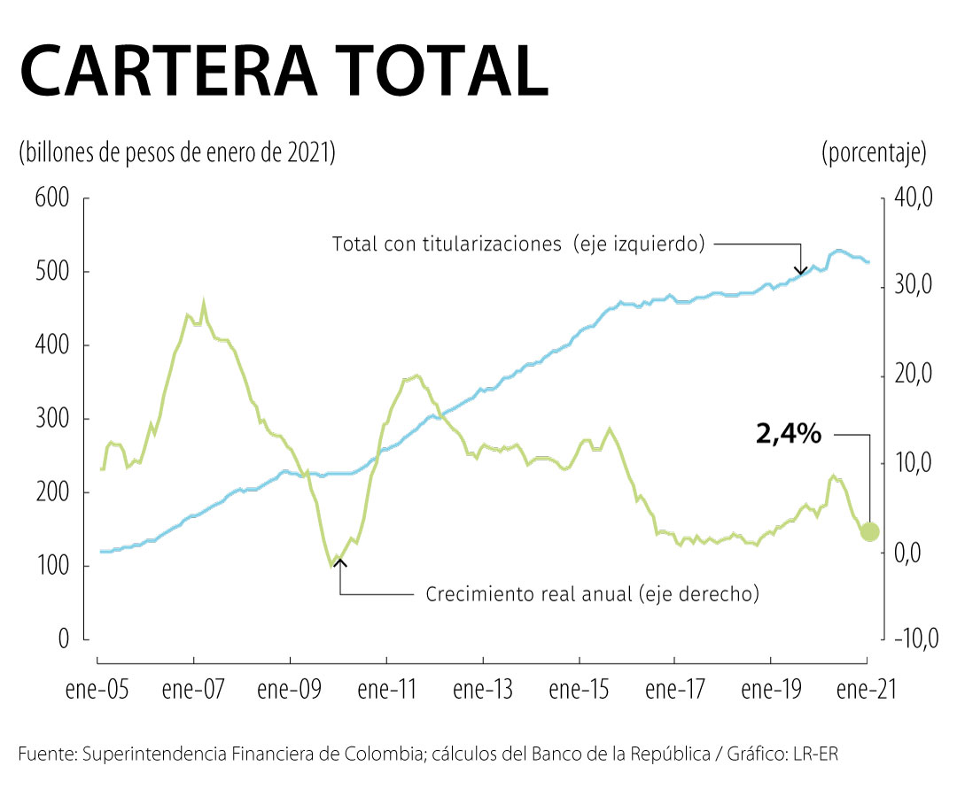 El Banco de la República, en su reporte de estabilidad financiera del primer trimestre, dio a conocer que a enero de 2021 los activos económicos de los establecimientos de crédito del país ascendieron a $764,3 billones, reportando una tasa de crecimiento real anual continuo con tendencia a la baja desde abril de 2020.