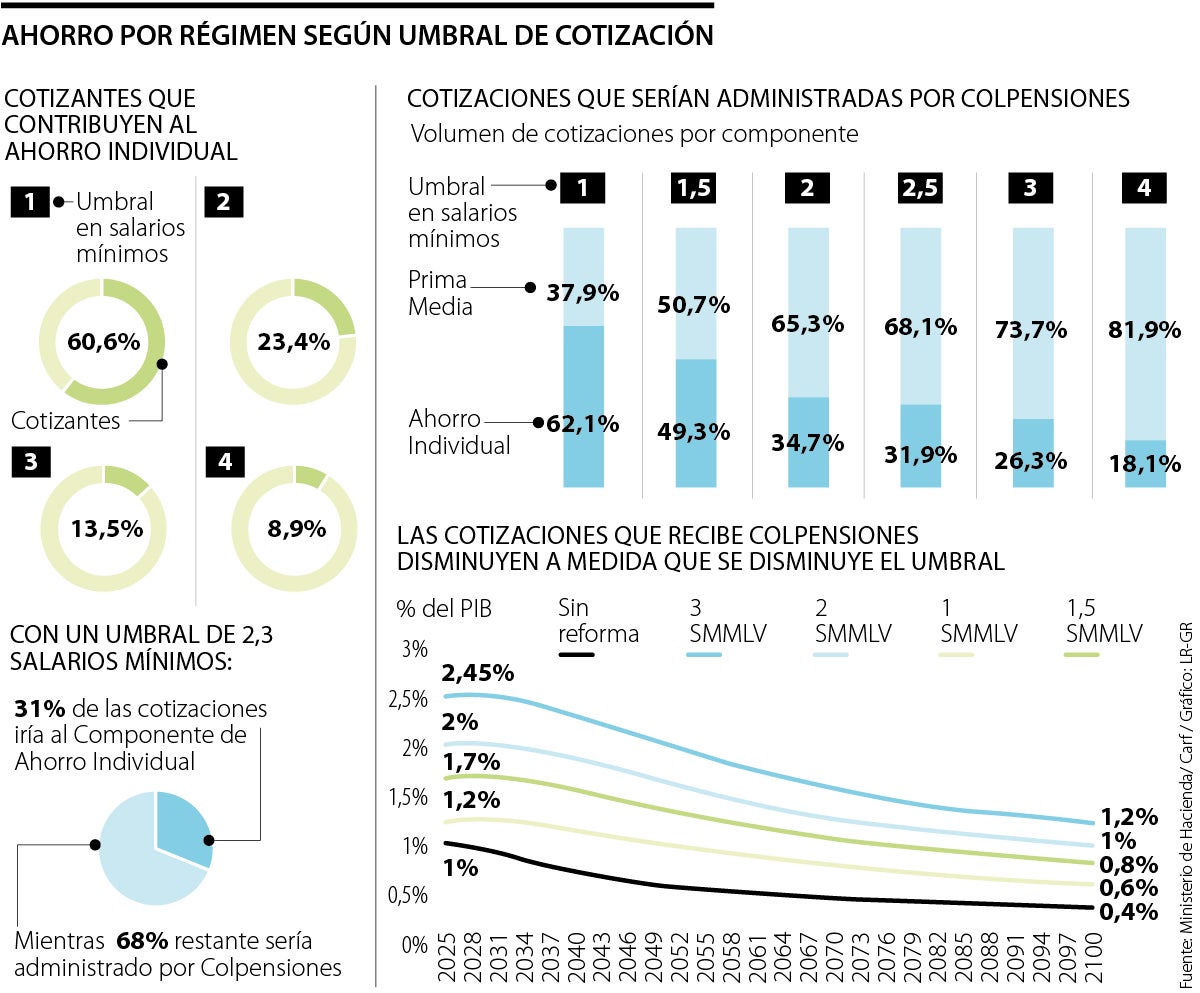 Con esta reducción, el Gobierno pasaría a controlar poco menos 68% del volumen de cotizaciones de la fuerza laboral, mientras que con tres salarios iba a quedar con 73,7% de las pensiones. Aún así, la propuesta, al Gobierno le entrarán más recursos que con el umbral de 1,5 salarios mínimos (49,3%).