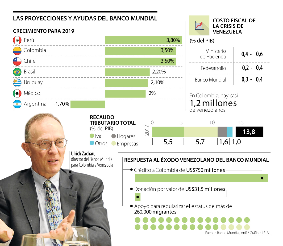 En ese sentido, el Banco Mundial será una institución clave para responder al éxodo venezolano pues lanzará un crédito de libre destinación por US$750 millones con el objetivo de contribuir a la sostenibilidad fiscal, la competitividad y la migración. “Ya se anunció una donación de US$31,5 millones y los otros US$718,5 millones son créditos. Se llevará a consideración de la Junta del Banco el próximo mes”, manifestó Zachau, quien también dijo que un crédito para la Dian estaría listo en los próximos meses.