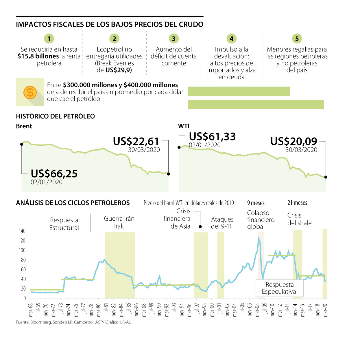 La reducción de la renta petrolera es quizás uno de los impactos más graves que afronta el Gobierno si el petróleo sigue barato. El Ministerio de Hacienda planteó a inicios de 2020 un barril Brent a US$60, por lo que con la cotización actual (US$22) dichos ingresos se podrían reducir en cerca de $15,2 billones. La cifra obedece a que por cada dólar que cae el precio del crudo se dejan recibir entre $300.000 millones y $400.000 millones, según la ACP y Campetrol.