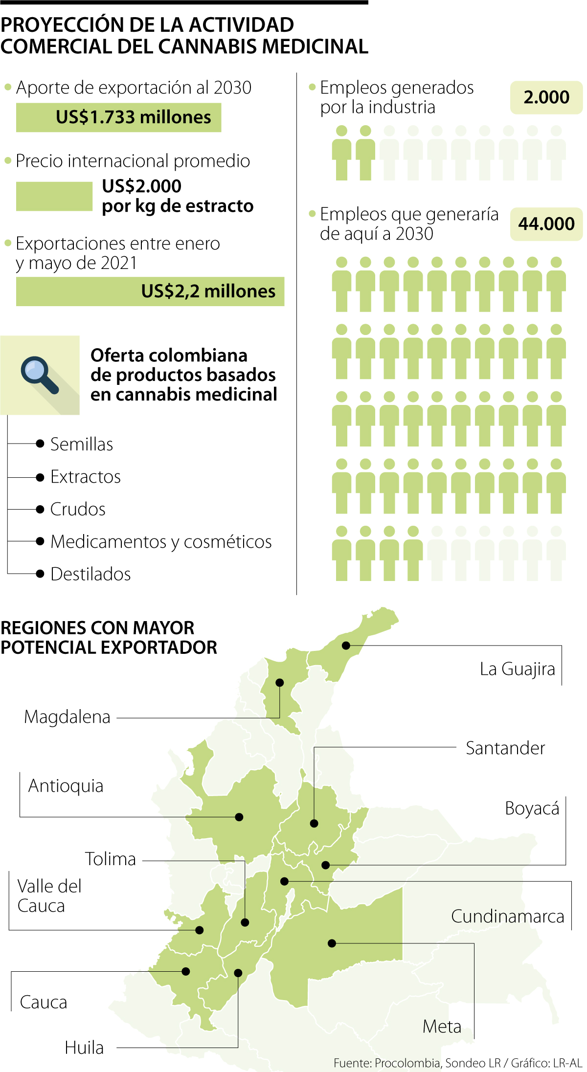 Las estimaciones de ProColombia, basadas en la información del Dane y Fedesarrollo, bajo un escenario de precios internacionales intermedio de cannabis medicinal (US$2.000 por kg de extracto), proyectan un nivel de exportaciones en 2030 de US$1.733 millones, que es superior al valor de las exportaciones actuales de productos como las flores, que ocupan el segundo lugar en las ventas externas no minero-energéticas.