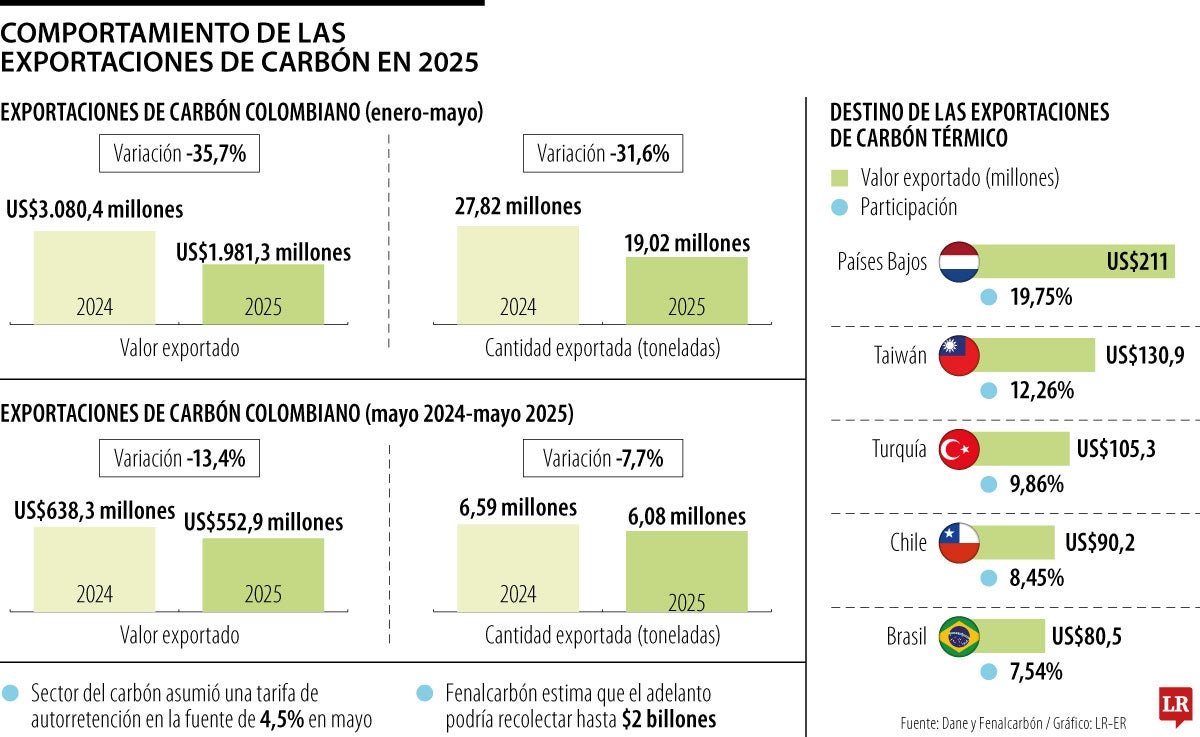Del lado de las exportaciones y de acuerdo con cálculos del Dane, la exportación de carbón ha visto una caída en lo corrido del año de 35,7%, pasando de US$3.080,4 millones entre enero y mayo de 2024 a US$1.981,3 millones en el mismo periodo de 2025.
