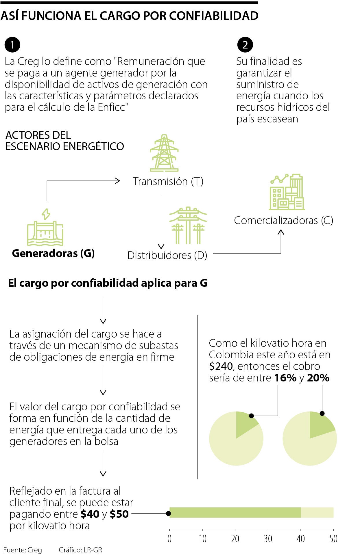 El cargo por confiabilidad es, en pocas palabras, un seguro que evita un apagón. Se define en esencia como la “remuneración que se paga a un agente generador por la disponibilidad de activos de generación con las características y parámetros declarados para el cálculo de la máxima energía eléctrica que puede generar una planta (Enficc)” según la Comisión de Regulación de Energía y Gas (Creg).